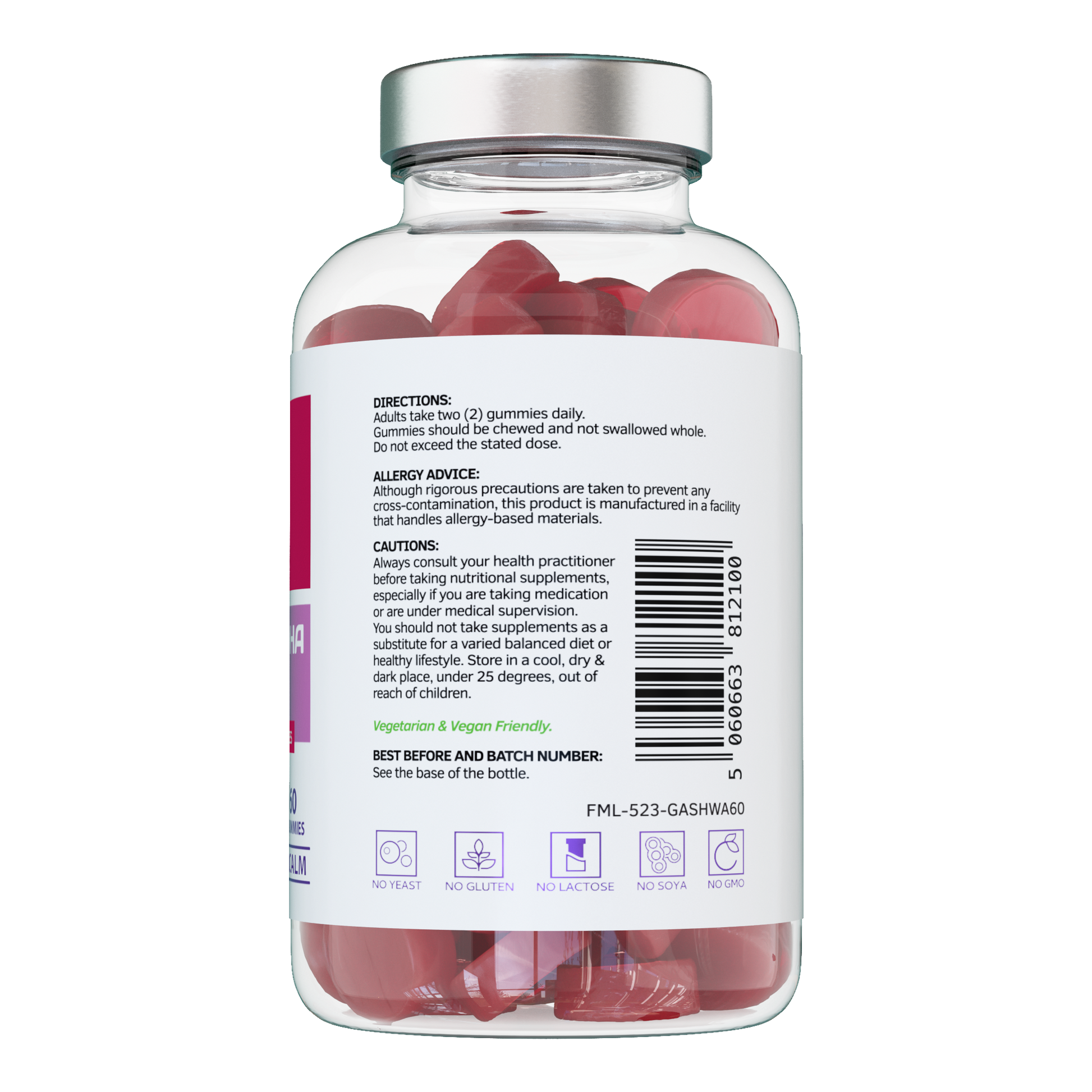 Ashwagandha Root Extract (Withania somnifera), Maltodextrin, Trisodium Citrate (Acidity Regulator), Coconut Oil (Oil Coating), Anthocyanins (Natural colouring), Magnesium Citrate, Natural Raspberry Flavouring, Carnauba Wax (Anti-caking Agent), Glucose Syrup, Sugar, Water, Pectin (Gelling Agent), Citric Acid (Acid).